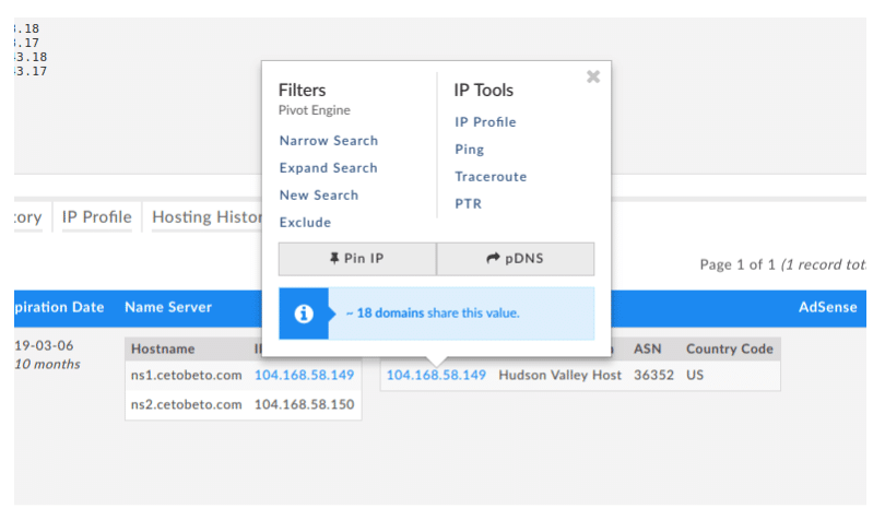 If I look at the Iris domain row for each of 1ink[.]cc and bandirun[.]com, I don’t see any pieces of data that directly relate these two sites. However, Iris is a great infrastructure exploration tool on its own, so lets do some pivoting and see if I can find something related. If I expand on bandirun[.]com’s IP address, I will get a list of hosts that share that IP.