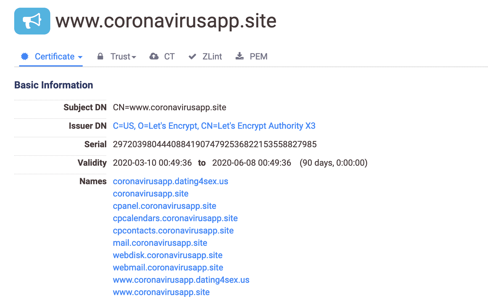 The coronavirusapp[.]site domain was originally registered on March 8, 2020 using domain privacy to obscure the registrant details. The site is hosted on Wrathost, a provider of cheap shared hosting. For that reason the domain is on an IP address shared with over 100 other domains not related. However, looking at the Let’s Encrypt SSL certificate for the domain revealed one other domain that was also serving up the malicious Android application: dating4sex[.]us.