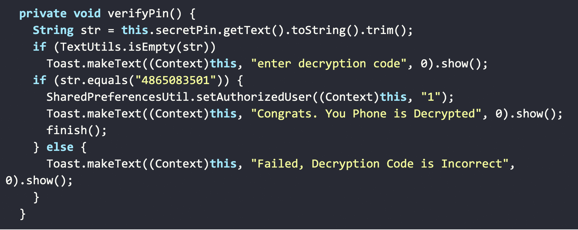 CovidLock’s author did not bother implementing any type of obfuscation of the key in the application’s source code. While it’s easy to write about how this is not sophisticated from a malware development standpoint, it’s important to note that CovidLock is still effective at its lock-screen attack.