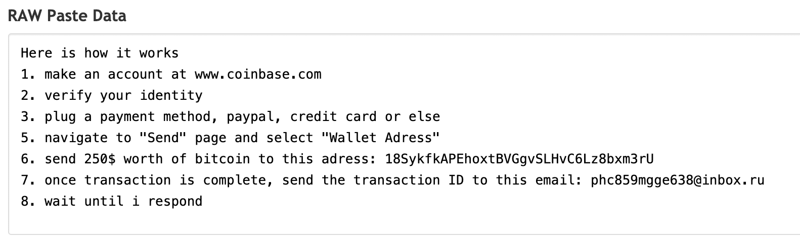 The ‘Pastebin’ site displays a paste that shows the attackers BitCoin wallet ID, and the rest of the ransomware note. The data from the pastebin site gets pulled into the dynamically generated ransom note that gets pushed to the victim’s screen post-lock.
