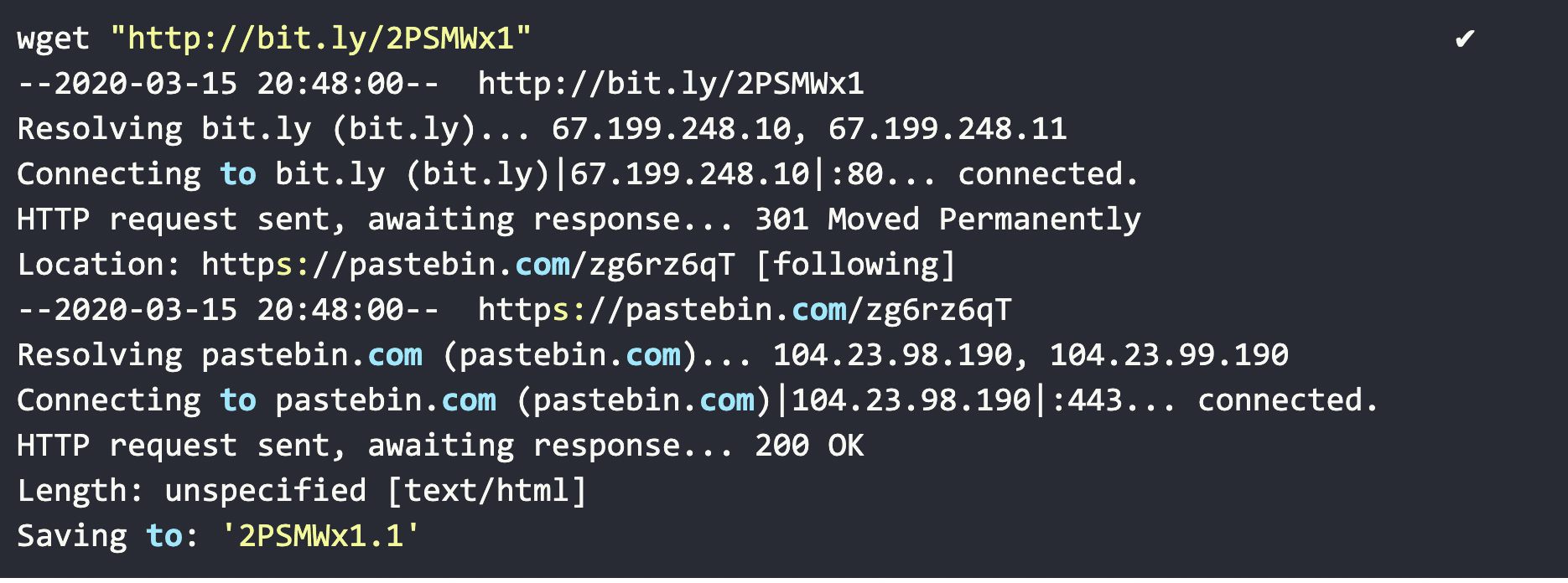 Tracing the network operations of that ‘bit.ly’ link, we can see a redirection to a pastebin site ‘https://pastebin.com/zg6rz6qT’.