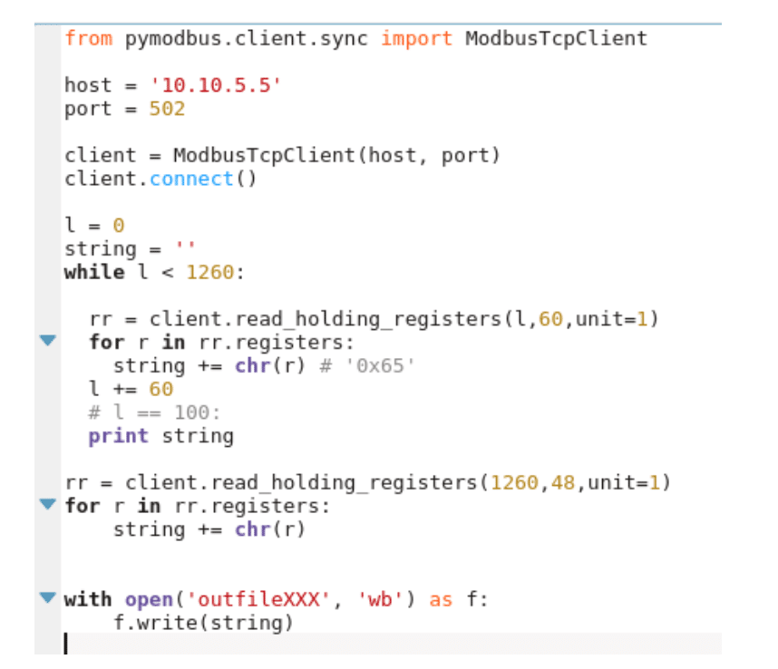 In order to extricate this, we wrote a simple python program to read from modbus and gradually worked on figuring out how long the file was (based on error conditions).