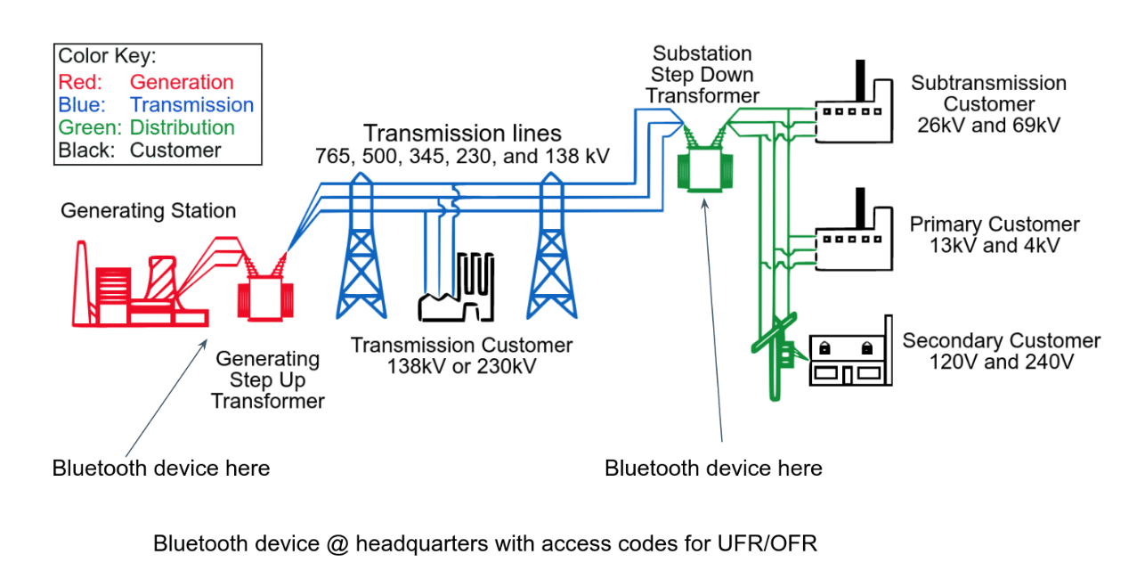 In the scenario, the headquarters device held over frequency response (OFR) / under frequency response (UFR) codes. OFR/UFR are a little over my head, but essentially they are codes that would communicate that power is Over Frequency Response or Under Frequency Response. The receipt of an access code for this information would trigger an operator to compensate.