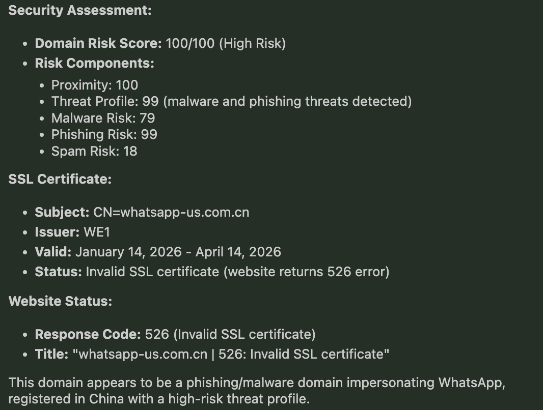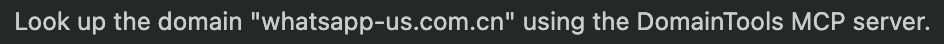 Here's how it works. Using an AI agent connected to the DomainTools MCP server, we asked for a lookup of whatsapp-us.com[.]cn, a domain linked to malware targeting Chinese-speaking users.