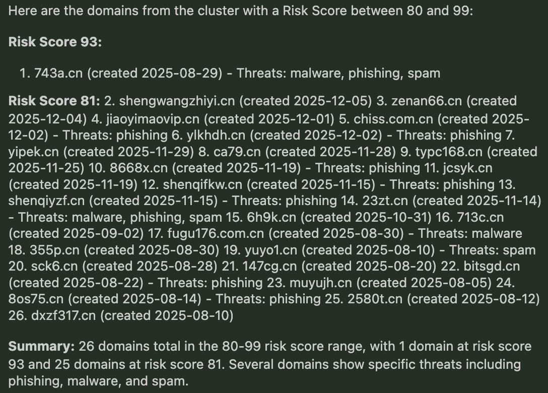We can then filter that cluster further with a targeted follow-up query — pulling only the domains with a Risk Score between 80 and 99 for prioritized review.
