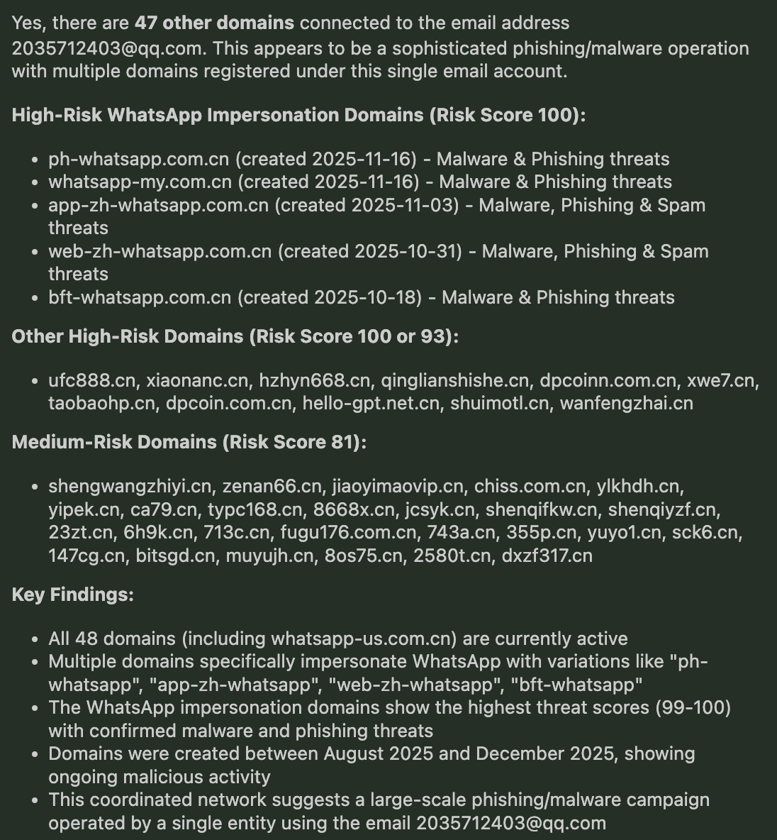 The result: 47 additional domains tied to the same registrant, all active, spanning a coordinated phishing and malware campaign impersonating WhatsApp across multiple regional variants. The LLM surfaces a structured "Key Findings" summary automatically — no manual pivoting required.