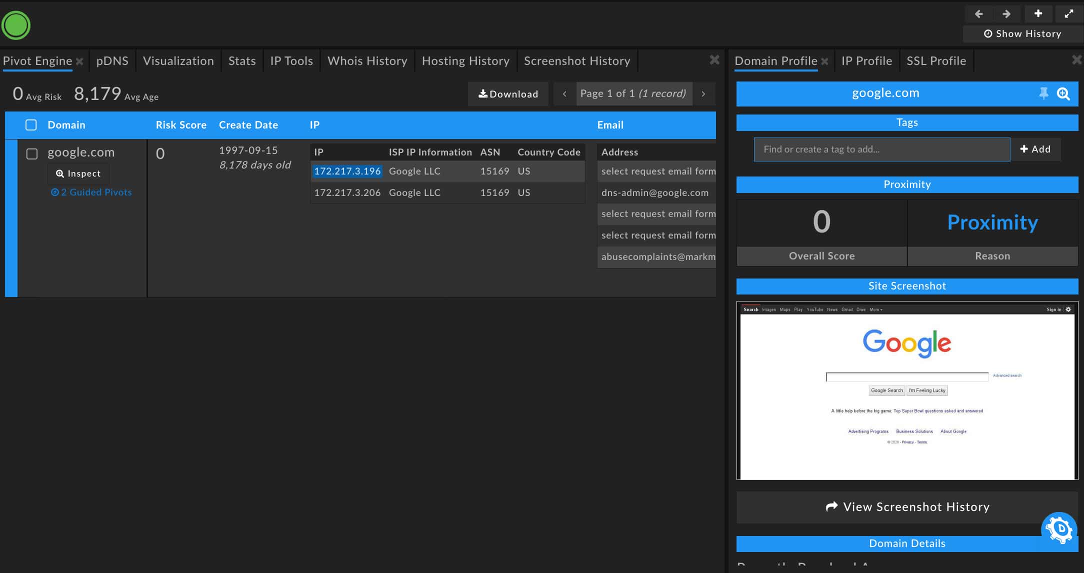 Default view, highlighting the Pivot Engine and the Domain Profile with risk scores and screenshots