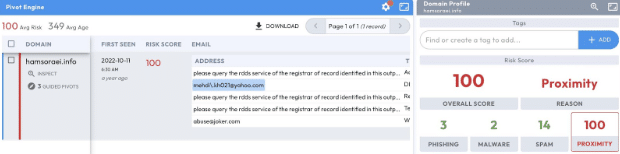 As we start to look into the domain mentioned in the text message, Figure 2 glows in the dark with a risk score of 100, the highest you can get, reflecting both the infrastructure and other previous malicious activity as well as other domains associated with it. In this case, the score is in part tied to the domain’s start of authority record (SOA), a Yahoo email mehdi\.kh021@yahoo[.]com. This unique email address, containing a backslash, is associated with 71 other domains. From here, guided pivots in Iris Investigate can be a helpful way to quickly identify more domains from this initial indicator of compromise (IOC).