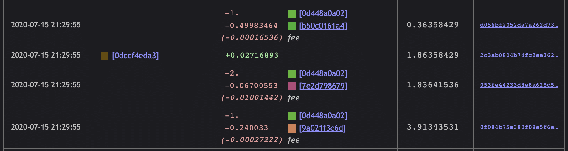 The timestamps for these transfers all occur within the same window of time, generally, July 15th 2020 21:02 to July 15th 2020 21:29. That’s about 17 minutes.