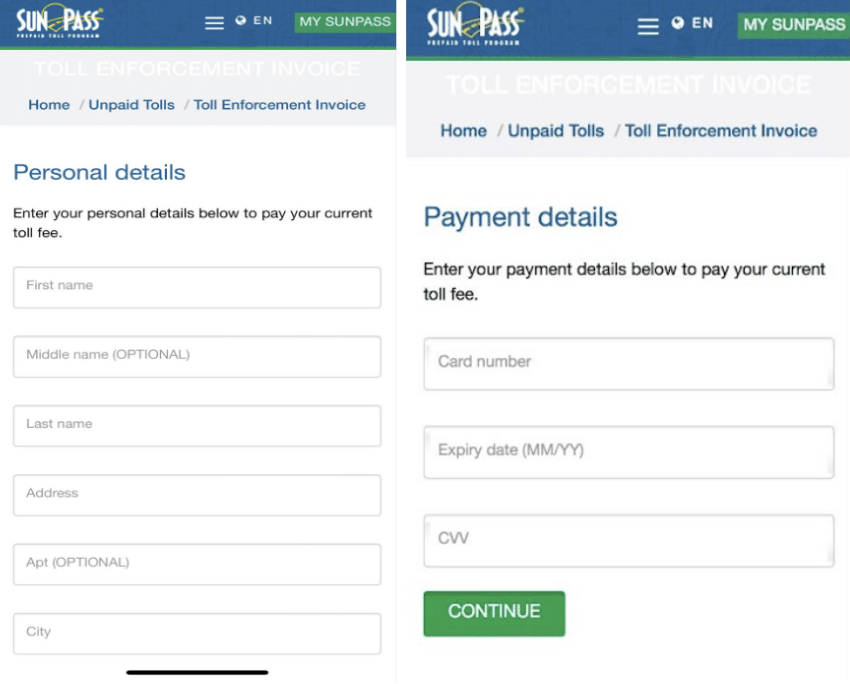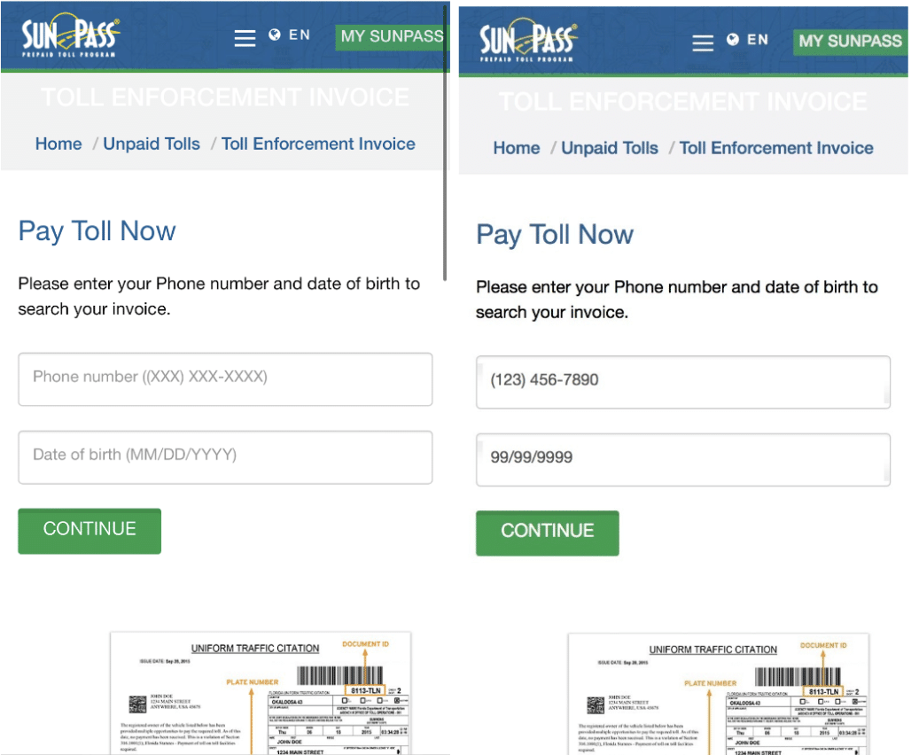 Using a secure mobile browser, we navigated to sunpasstollservice[.]com which first prompted us to complete a ReCaptcha verification filter then loaded a landing page designed to look like a legitimate bill payment page used by SunPass, Florida’s electronic toll collection system. The landing page prompts victims to enter their phone number and date of birth, giving the victim a false sense of verification legitimacy.