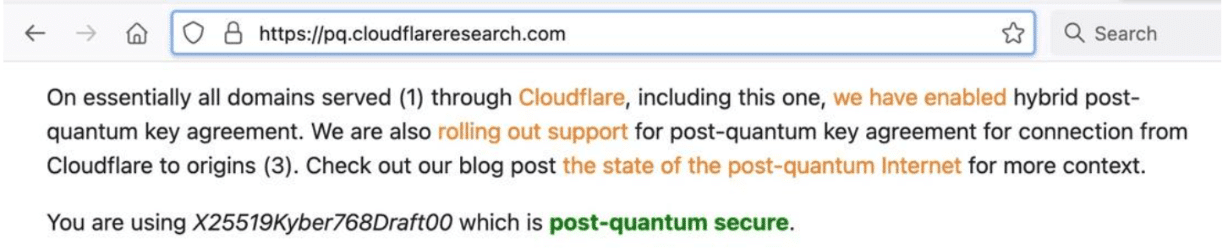 At least in the case of Chrome, Firefox, Brave, and Opera they’re all using a hybrid algorithm called “X25519Kyber768Draft00.”39 Want to check/confirm? Visit https://pq.cloudflareresearch.com/ – it will conveniently confirm if you’re using that protocol:
