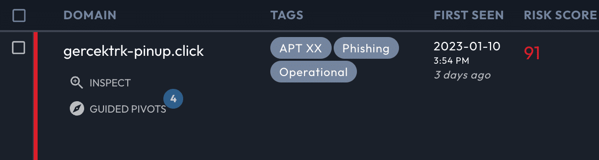 Iris Investigate highlights any field that can pivot to 500 or fewer domains, a range that typically indicates a useful investigation target. Often, the smaller the number of pivots, the more useful the connection to another domain may be. For each of the Guided Pivots, the average risk of the associated domains is shown as a quick indicator of severity.