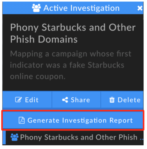 Investigations are containers that organize a collection of search queries and results, search trails, data pivots, notes, and more. The Collaborate section explains how to share and export investigations.