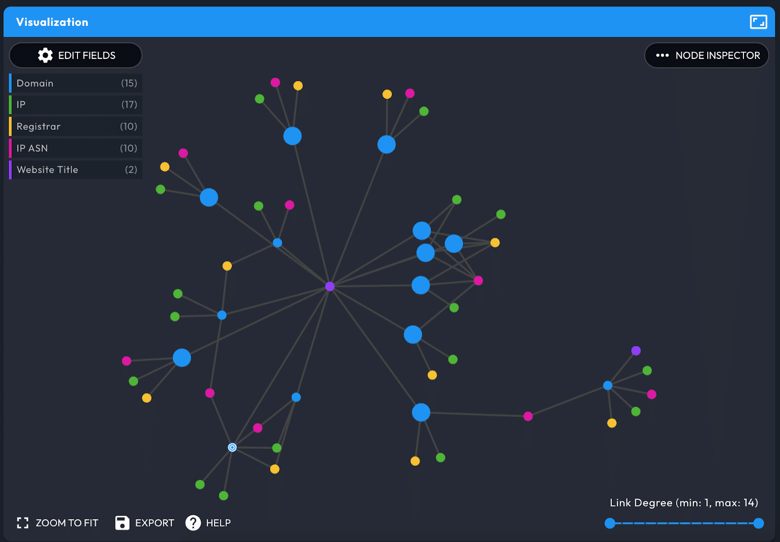 The Visualization Data Panel is a visual representation of connections between domains in the Pivot Engine. It depicts domains as blue nodes; the color-coding for the others can be seen in the legend in the upper left. A domain can either be a larger or normal sized dot. The larger dots represent domains with high risk scores of 70 or higher. The legend also shows how many instances there are for each field in the graph. Select Edit Fields to choose up to 4 fields (plus domain) to view.